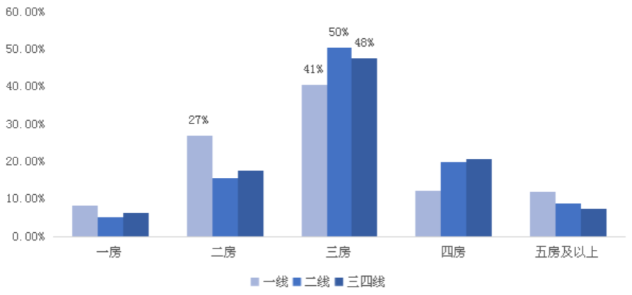 而三四線城市的庫存壓力與一二線略有不同,除了一房和五房以上,二房同樣存在庫存和成交占比的“剪刀差”,事實上,對于多數三四線城市而言,品牌房企的全國化擴張客觀上也加速了人們從剛需逐步過渡至改善,雖然局部城市房價也上漲至高點,但是整體的購房壓力還是不及核心一二線城市的,因而三房和四房的累計成交占比也顯著高于核心一二線城市,這兩個戶型段雖然庫存高企但后期基本不存在去化壓力,相較而言二房同樣缺乏足夠的吸引力,未來仍存在去化難題。
