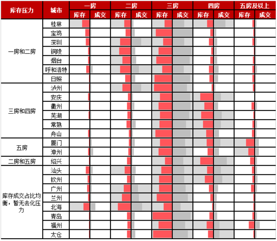 聚焦單個城市,多數高庫存城市各個房型供需關系正常,庫存無明顯積壓現象,少部分城市三房主力戶型庫存不足,其余房型存量過多。
