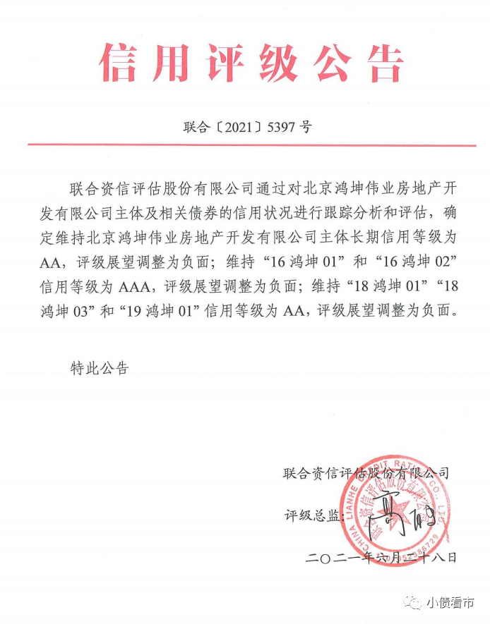 同時,維持鴻坤地產“16鴻坤01”和“16鴻坤02”信用等級為AAA,評級展望調整為負面;維持“18鴻坤01”“18鴻坤03”和“19鴻坤01”信用等級為AA,評級展望調整為負面。