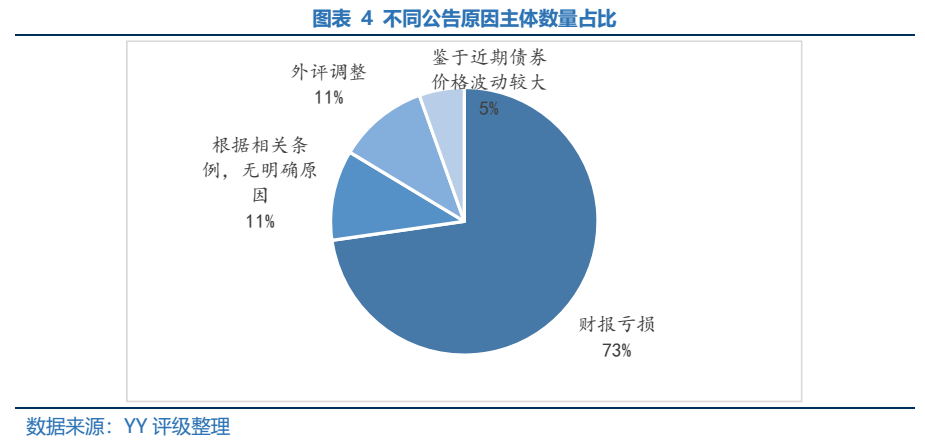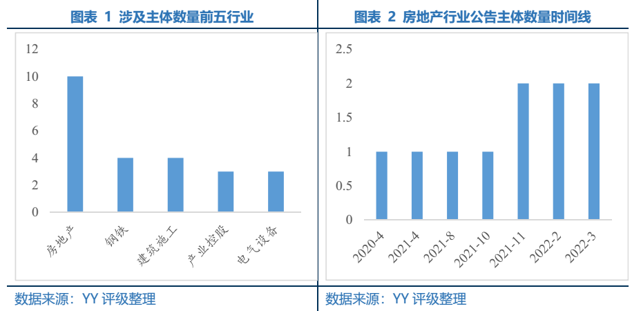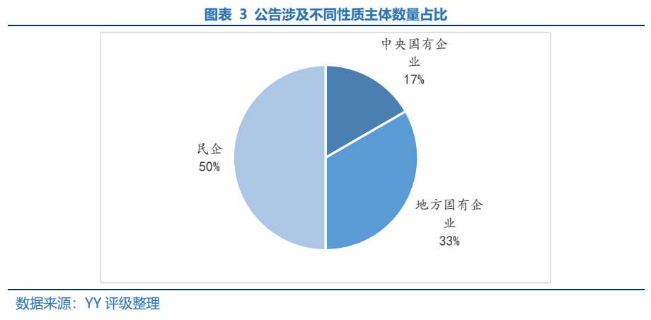 總體來看,公告后主體層面出現(xiàn)展期或者實質(zhì)違約情況的有11個,主體數(shù)量占比20%,涉及債券48只,債券數(shù)量占比39.7%;主體YY評級在公告后下調(diào)涉及的主體數(shù)量26個,主體數(shù)量占比47.3%。公告后,也有部分主體信用資質(zhì)變好的情況,主體YY評級在公告后上調(diào)主要涉及山東魏橋,隨著行業(yè)周期修復,信用資質(zhì)有明顯改善,主體數(shù)量占比1.8%。