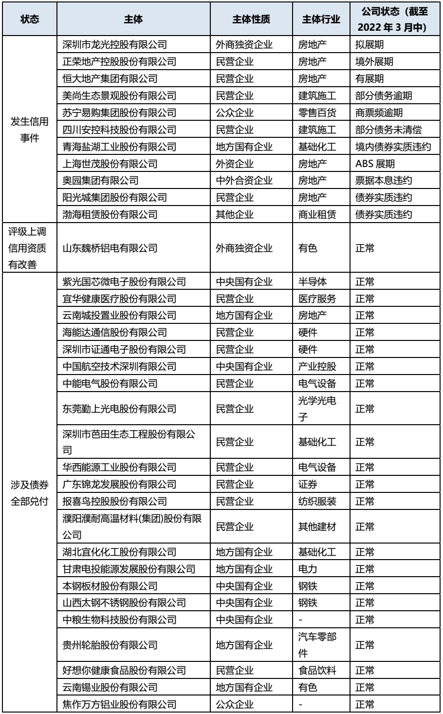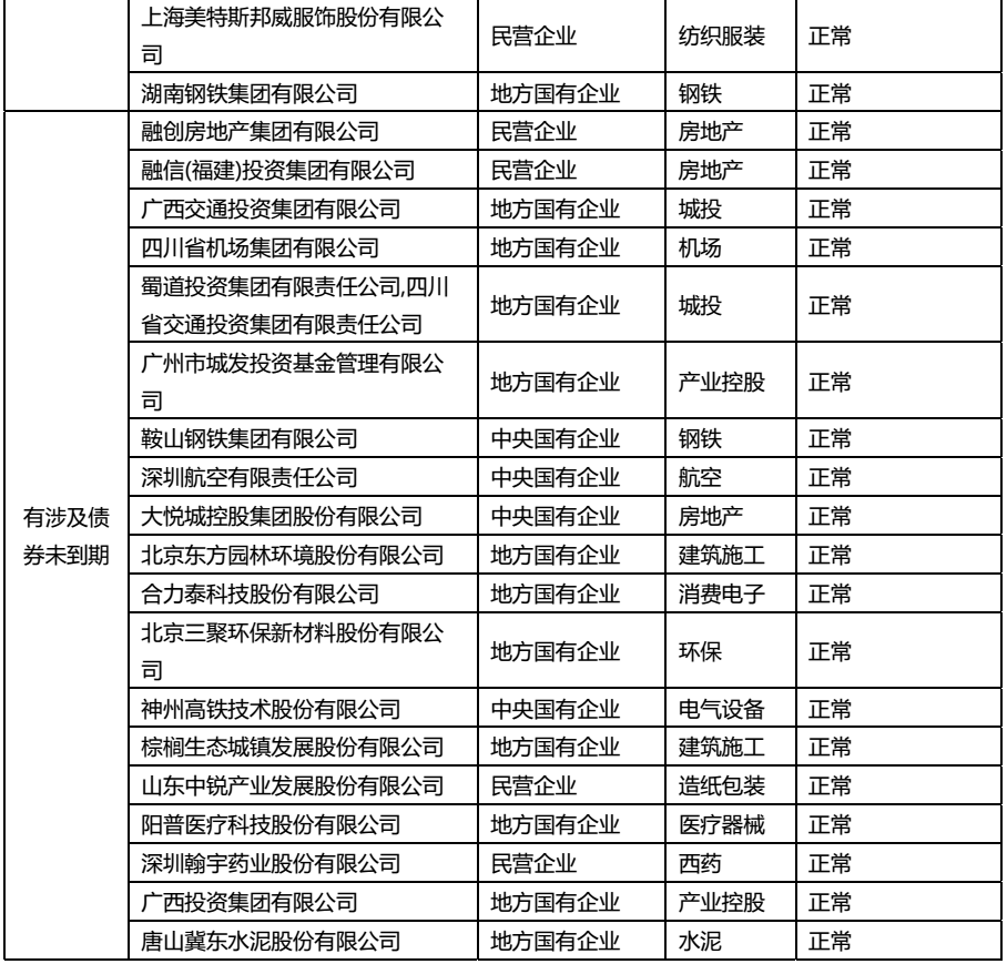 除如上主體層面出現(xiàn)信用事件的,目前主體狀態(tài)正常的,并在公告后涉及債券全部兌付完畢的主體有24個,數(shù)量占比43.6%,包括紫光國微、宜華健康、云南城投、海能達、證通電子、中國航空技術、中能電氣、東莞勤上、芭田生態(tài)、華西能源、錦龍發(fā)展、報喜鳥、濮陽濮耐、湖北宜化、甘肅電投、本鋼板材、山西太鋼、中糧生物、貴州輪胎、好想你、云南錫業(yè)、焦作萬方、美特斯邦威服飾、湖南鋼鐵。