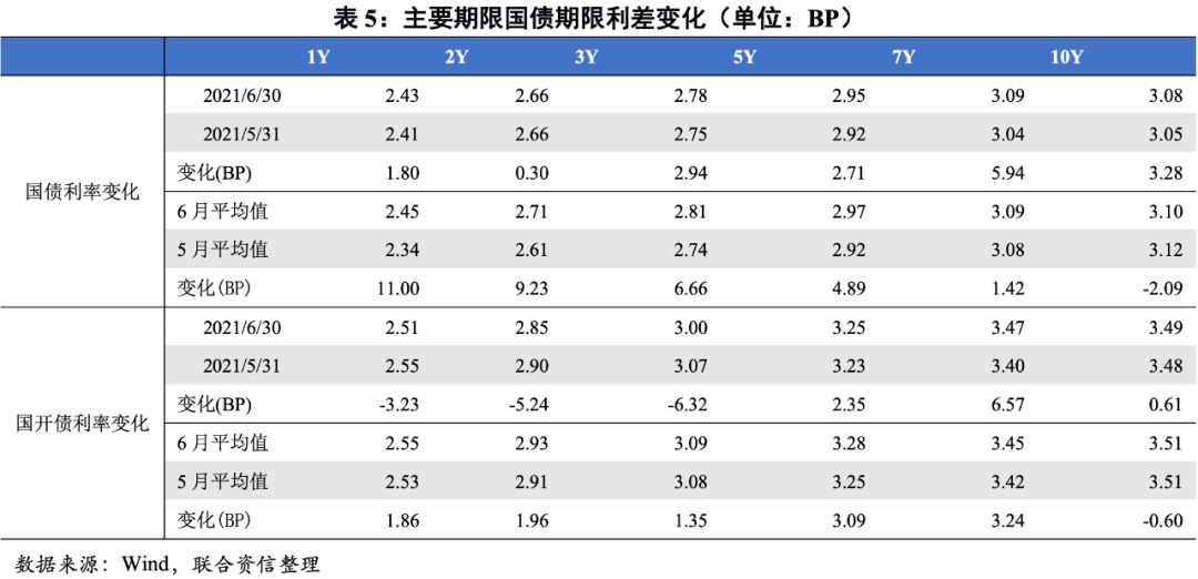 截至6月末,我國與主要經濟體的利差較5月末均進一步走闊,其中與美國的利差上升幅度最大。6月美國十年期國債收益率整體呈震蕩下行走勢,由1.58%下行至1.45%,主要是由于月初非農就業不及預期,市場修正對前期經濟增長樂觀的預期。三季度美國經濟預期較為樂觀,同時美聯儲釋放鷹派信號疊加美國通脹超預期上行,綜上分析預計三季度美債收益率有望重回上行渠道,中美十年期國債利差或將有所收窄。除美國外,6月我國與德國、英國和法國的十年期國債利差均值均有所上升,與日本利差則小幅收窄,日本國債利率下行幅度小于我國。