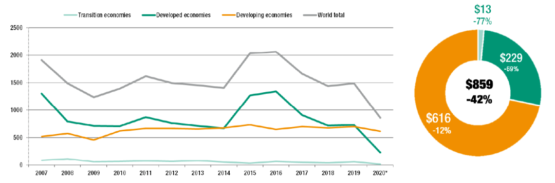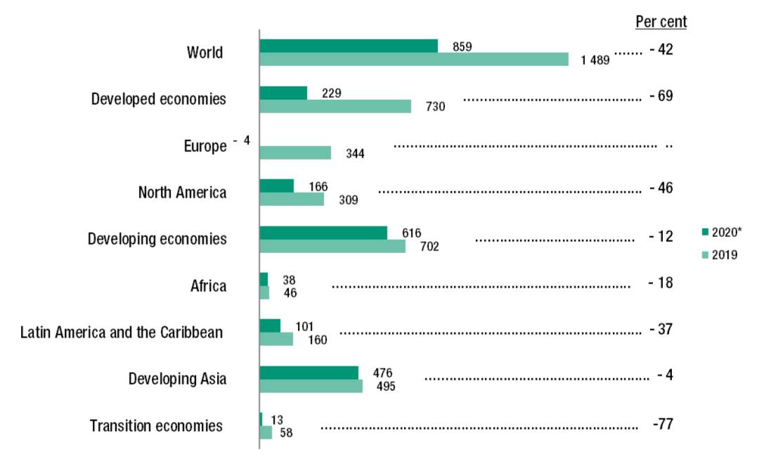 2021年1月,聯合國貿易與發展會議組織發布了第38份《全球投資趨勢監測》。報告顯示,因新冠肺炎疫情和美國政治局勢不明等因素的影響,2020年全球外國直接投資(FDI)急劇下挫,從2019年的1.5萬億美元直接下跌到了8,590億美元,跌幅達42%之巨。截至2020年底,外國直接投資的水平比2009年全球金融危機后的谷底還要低30%以上,回落至上世紀90年代的水平。