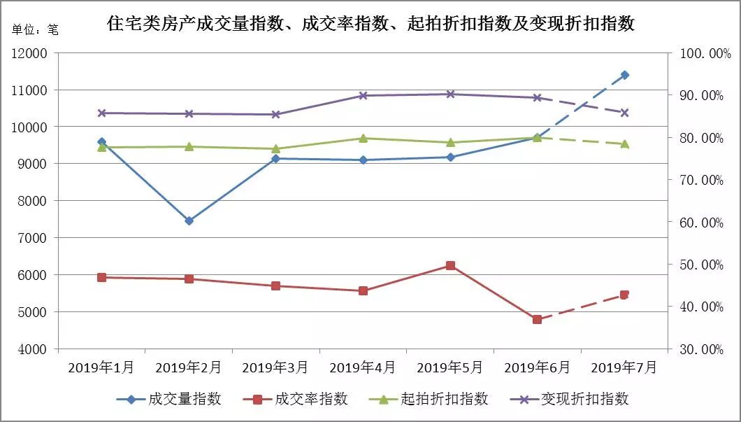 七月預測:成交量在2562至3002筆左右,成交率指數區間[17.83%,19.54%],月起拍折扣指數區間[74.58%,75.31%],變現折扣指數區間[77.89%,80.63%]。