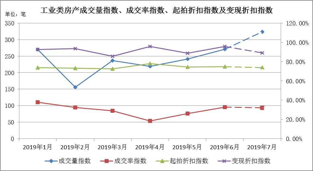 (三) 工業類房產:成交量、成交率雙升,起拍折扣指數趨于穩定,變現折扣指數呈上升趨勢
