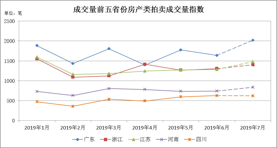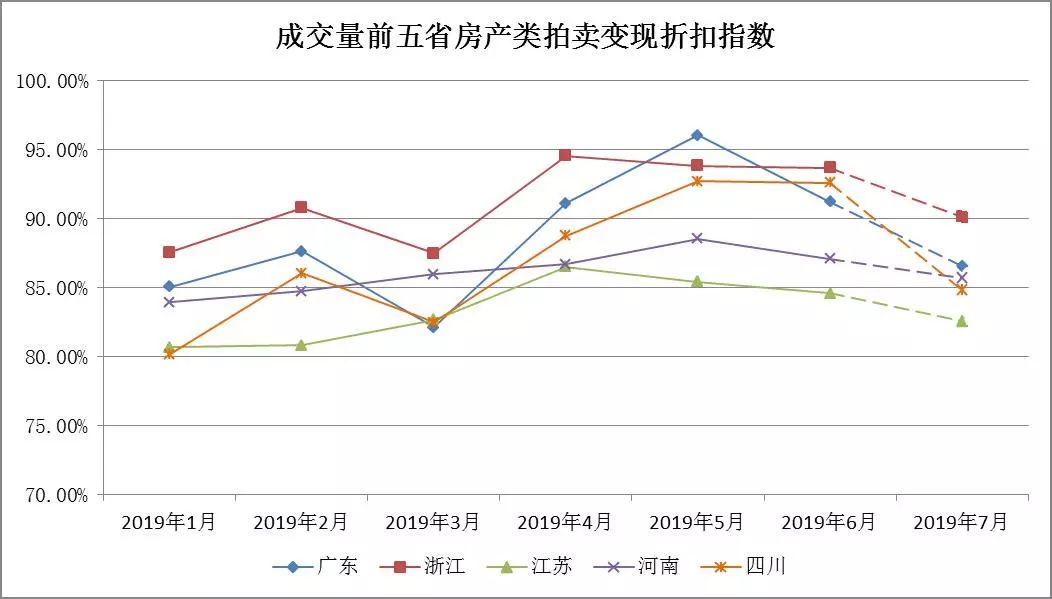 本部分展示2019年6月成交量排名前五省份的房產類成交量指數、成交率指數、起拍折扣指數與變現折扣指數。6月份成交量前五省為(從大到小):廣東、浙江、江蘇、河南、四川。相較于5月,山東省被四川省超越,跌出前五。