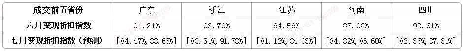 七月預測:成交量在299至348筆左右,成交率指數區間[30.56%,33.42%],起拍折扣指數區間[73.01%,74.64%],變現折扣指數區間[86.01%,91.91%]。