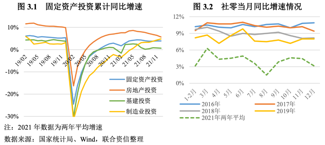 2022年雖然面臨三重壓力,但在政府穩增長強力托底政策的作用下,預期增長目標的實現應該沒有大的問題。實現今年目標,最大的困難是克服或逆轉去年下半年以來的過快下行趨勢。去年下半年以來的過快下行,主要的原因在于高基數效應的作用,投資增速下滑(主要是房地產和基建投資),消費受疫情多點頻繁復發而受到嚴重抑制,以及能耗雙控等政策的嚴厲執行導致的限電限產、部分行業整頓等。我們觀察到,去年四季度以來,政府開始政策糾偏,各行業逐步步入常態發展,過激政策對經濟的負面影響逐漸消失。