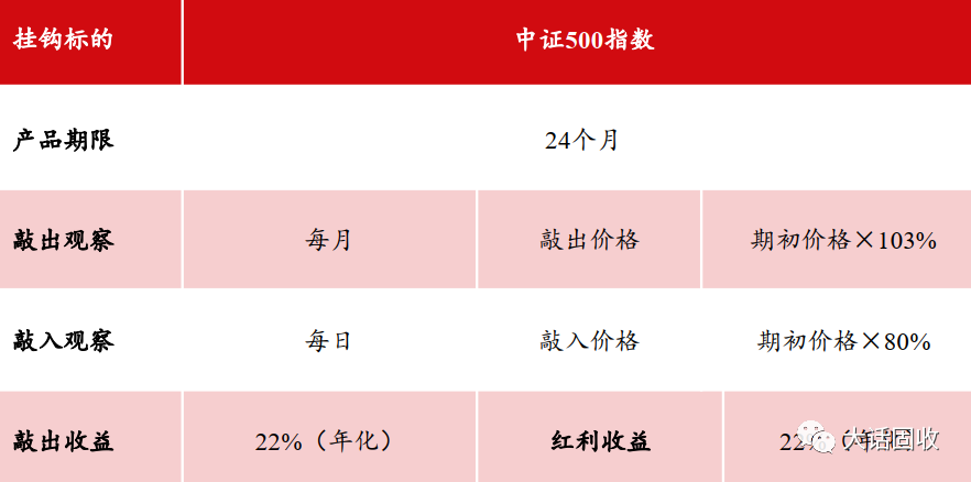 這個產(chǎn)品里面,“西瓜”就是“中證500指數(shù)”。敲出和敲入的價格設置為期初價格的103%和80%;“打賭”的收益率定的是22%。