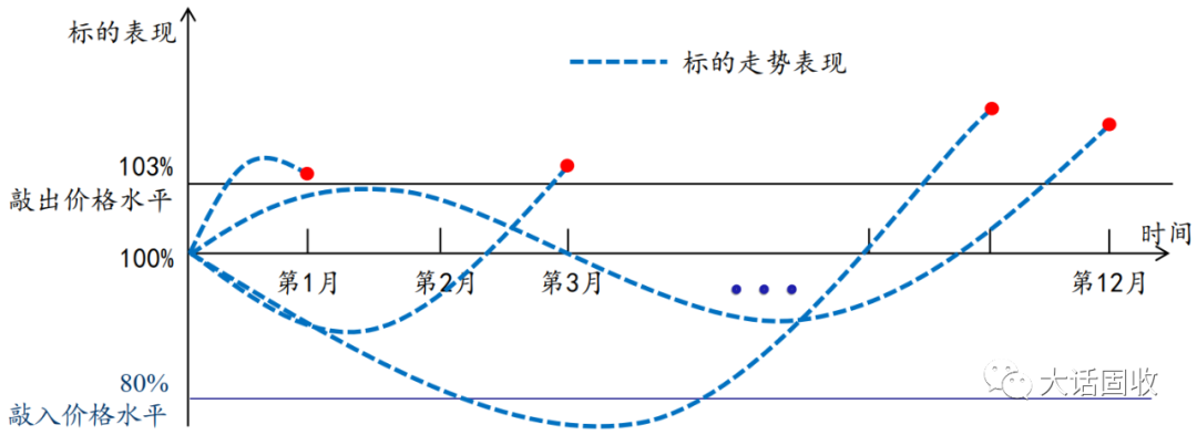 如果存續(xù)期內標的指數(shù)跌破了期初價格80%,到期的時候又回到了期初價格之上,但是沒有觸碰103%的上軌,那么投資者拿回自己的本金。