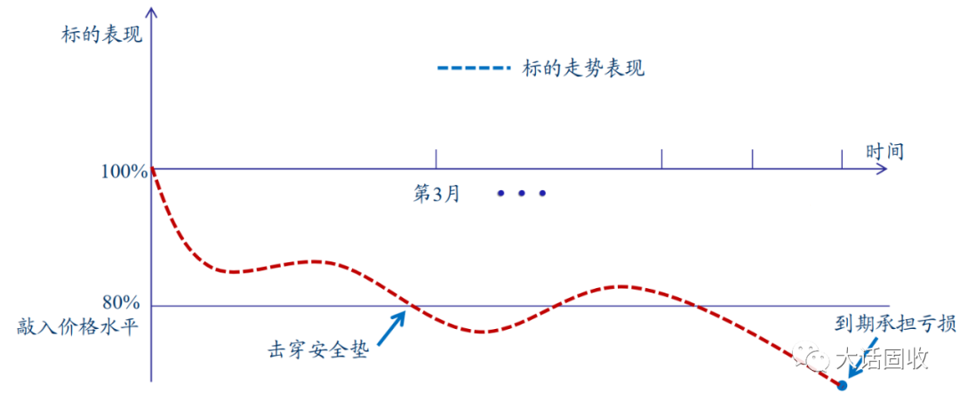 比較差的情況,標的指數(shù)在期間跌破了期初價格80%,而且到期的時候還在期初價格之下,那就要承擔本金虧損了。自然,離期初價格越遠虧得越多。
