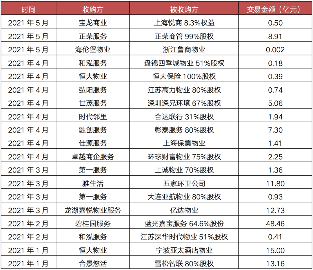 數(shù)據(jù)顯示,2021年以來(lái)物管行業(yè)的收并購(gòu)熱度高漲,中小型收購(gòu)事件持續(xù)不斷,據(jù)不完全統(tǒng)計(jì),2021年至今物管行業(yè)的收并購(gòu)事件總交易金額就已經(jīng)接近133億元,超過(guò)2020年全年的100億元。