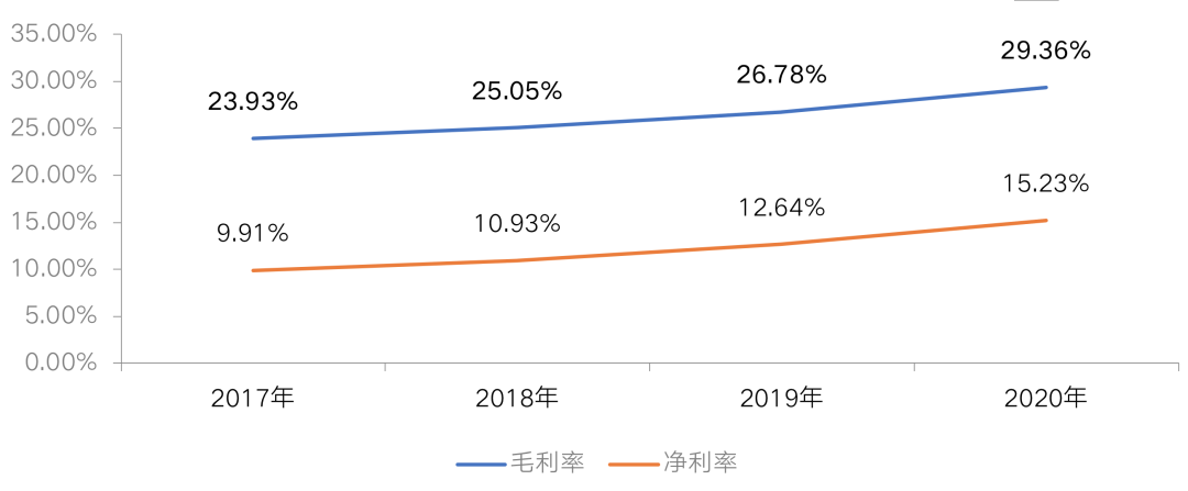 近年來(lái),隨著整個(gè)房地產(chǎn)行業(yè)規(guī)模見(jiàn)頂,相比傳統(tǒng)地產(chǎn)開(kāi)發(fā),物管行業(yè)現(xiàn)金流穩(wěn)健,經(jīng)營(yíng)風(fēng)險(xiǎn)相對(duì)較低,同時(shí)盈利能力也較為穩(wěn)定。從目前上市的物管企業(yè)2017-2020年的加權(quán)平均毛利率和凈利率來(lái)看,近年來(lái)物管行業(yè)的毛利率和凈利率都保持著穩(wěn)步上升的態(tài)勢(shì)。與此同時(shí),據(jù)CRIC監(jiān)測(cè),2020年典型上市房企的毛利率下降4.8個(gè)百分點(diǎn)至24.3%,凈利率也已下降至10%。