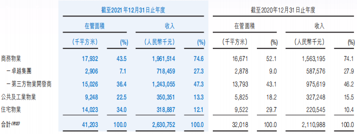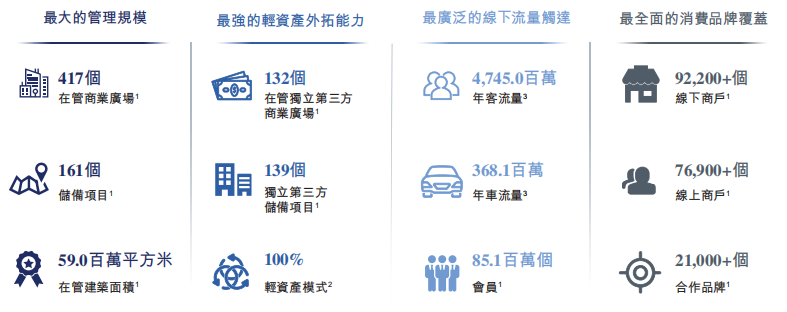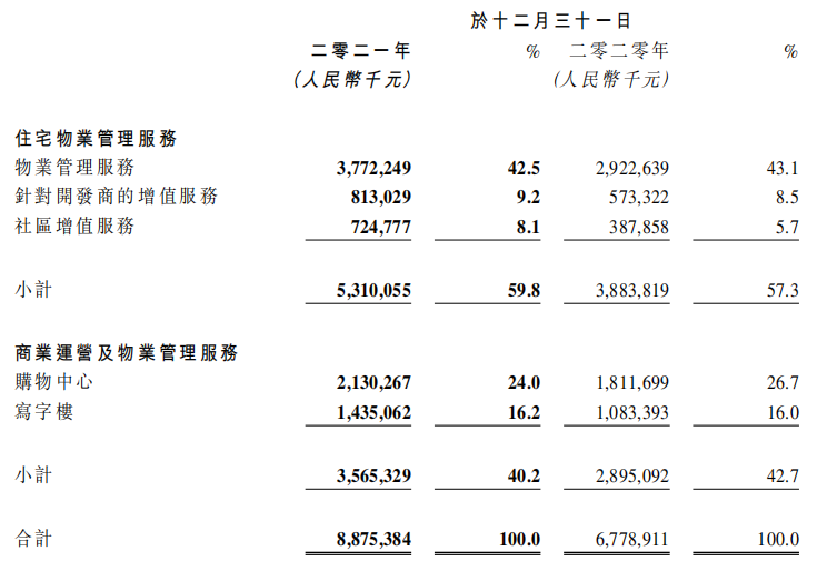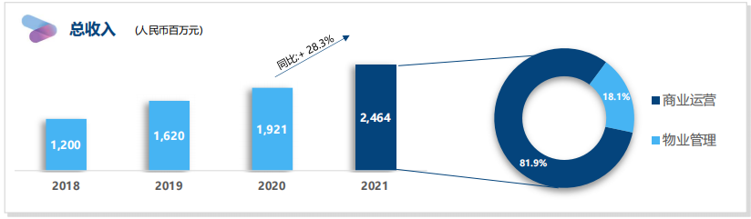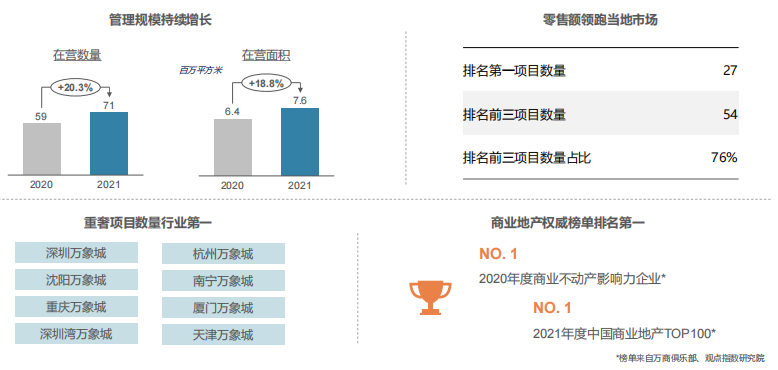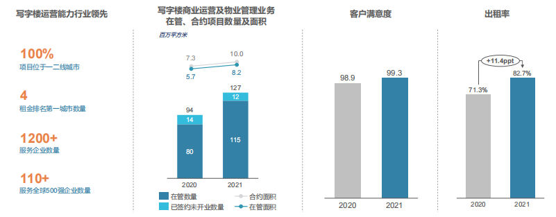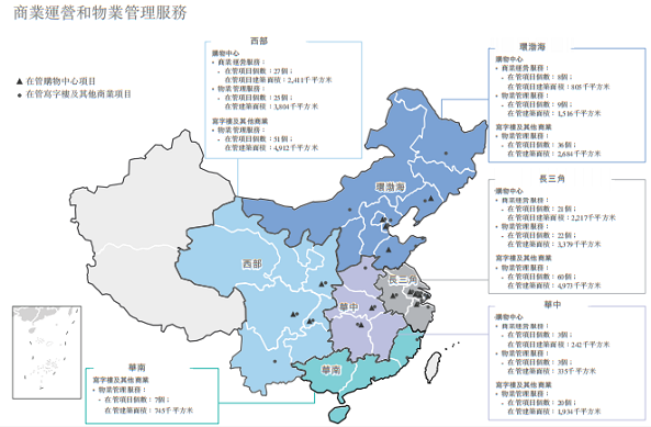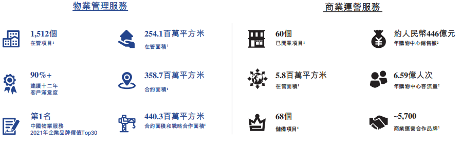 截至2021年底,集團住宅及其他物業管理業務覆蓋全國100個城市,合約面積1.859億平方米,在管面積1.468億平方米。提供商業運營服務的已開業購物中心數量為71個,已開業寫字樓數量為25個。