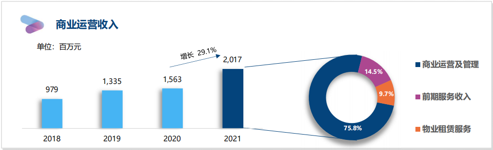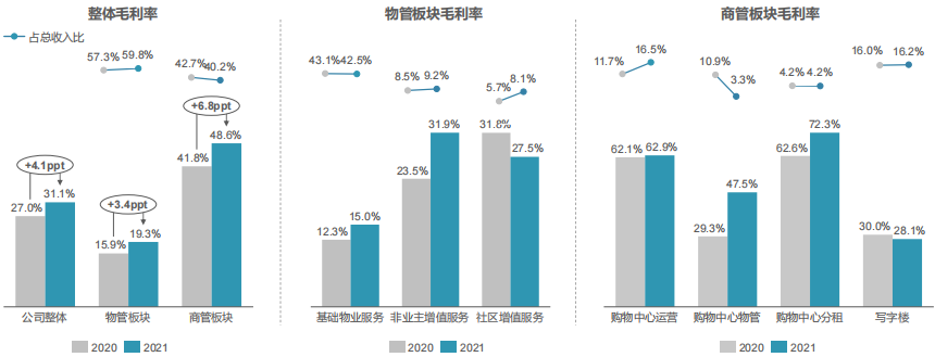 商管業務方面,公司商業運營業務仍占據核心地位,營收貢獻比達81.9%,2021年實現收入20.17億元,同比增加29.1%。商業運營服務業務實現毛利約7.11億元。