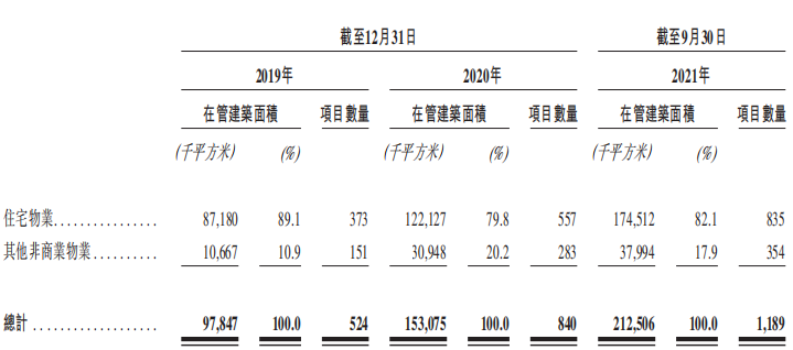 截至2021年9月30日,龍湖智創生活管理的物業管理服務建筑面積合共為2.368億平方米,在管項目1,422個(包括1,189個住宅及其他非商業物業、59個購物中心、174個寫字樓及其他商業物業)。
