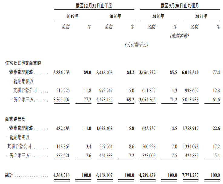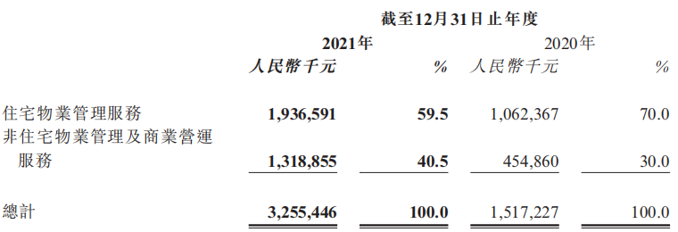 其中,住宅及其他非商業的物業管理服務占總收入的77.4%為60.12億元,商業運營及物業管理服務占總收入的22.6%為17.58億元。