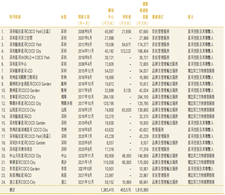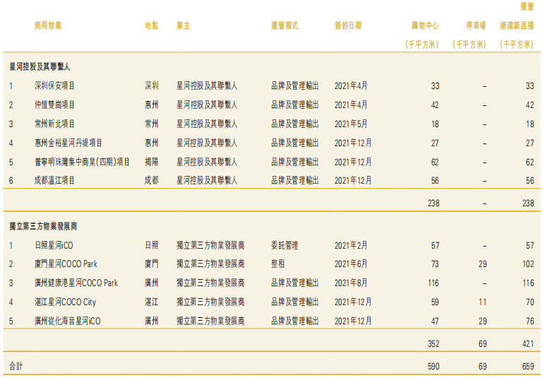 報告期間內,集團相繼與上海建工集團、廈門特房集團、廣州立白集團等建立合作,成功簽約日照星河iCO、廈門星河COCO Park、廣州健康港星河COCO Park、廣州從化海音星河iCO、湛江星河COCO City,共計5個第三方項目: