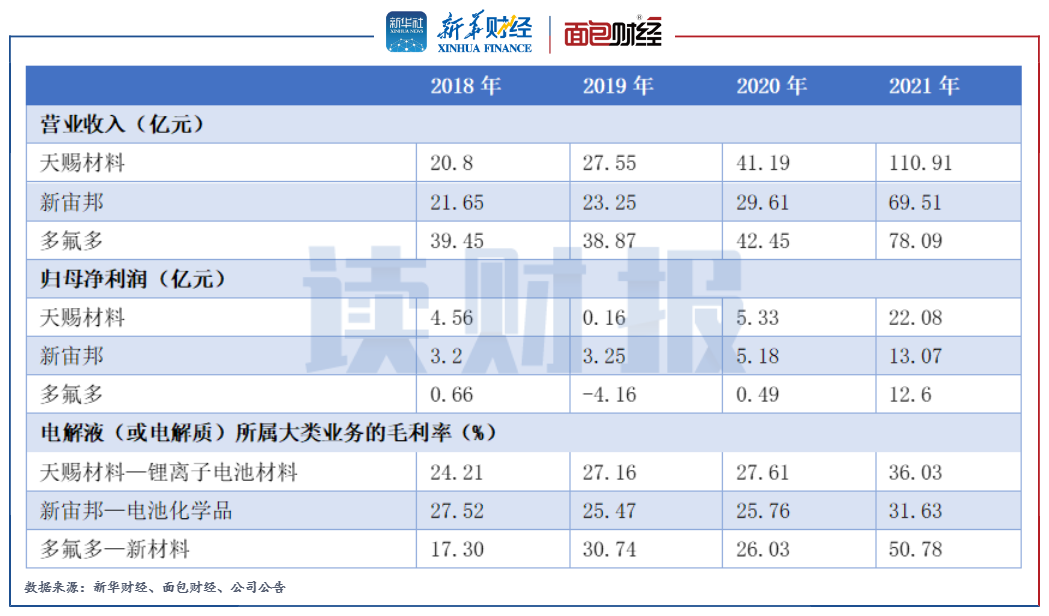 在鋰電電解液板塊中,行業(yè)領(lǐng)先公司多氟多、天賜材料和新宙邦已發(fā)布2021年年報。受益于下游鋰電池市場需求大幅增長,三家原材料公司的業(yè)績均顯著增長。