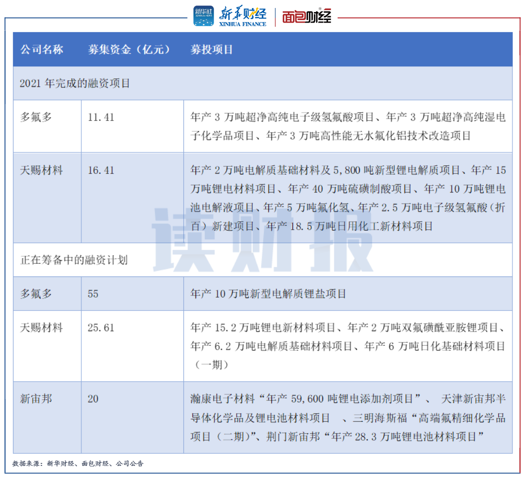 2021年,天賜材料和多氟多完成定增分別募資約16.41億元和11.41億元,且三家公司均拋出計劃擬通過兼并收購或引入新投資者的形式擴大經(jīng)營和資本規(guī)模。