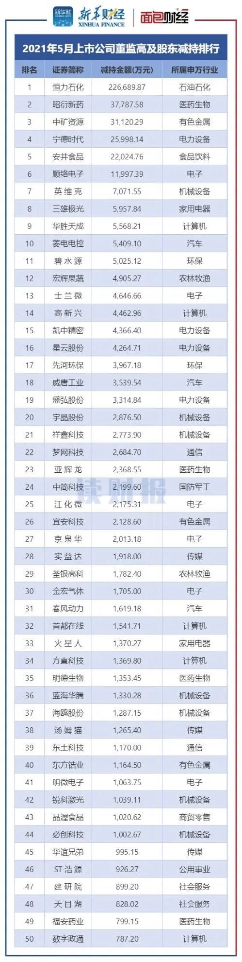 個(gè)股來(lái)看,恒力石化減持金額居首,昭衍新藥排在第二位,中礦資源位于第三位。其中,中礦資源董事孫梅春在5月份合計(jì)減持金額為3.11億元。另外,寧德時(shí)代及安井食品減持金額同樣居前。數(shù)據(jù)顯示,安井食品2位高管在5月合計(jì)減持金額為2.2億元。