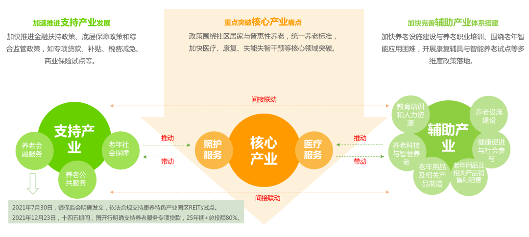 作為十四五首年,國家層面連續發布積極應對人口老齡化國家戰略舉措,明確十四五期間以“一老一小”為重點完善人口服務體系,完善養老服務體系,積極培育銀發經濟,推動養老事業和養老產業協同發展。