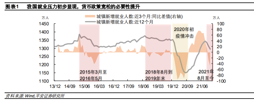 第二,就業(yè)壓力,可能會(huì)提升,貨幣寬松和房地產(chǎn)、基建的重要性凸顯。平安證券的研報(bào)說(shuō),從滾動(dòng)12個(gè)月的城鎮(zhèn)新增就業(yè)人數(shù)可以看到,2021年9月以來(lái),我國(guó)新增就業(yè)人數(shù)已經(jīng)出現(xiàn)顯著下滑;到2021年11月,新增就業(yè)人數(shù)已經(jīng)遠(yuǎn)低于疫情前的中樞水平。