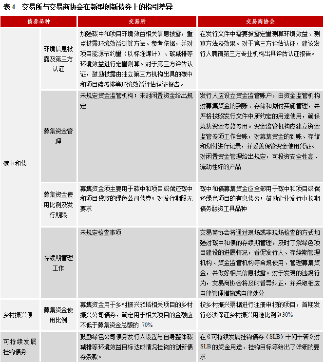 今年,交易商協會接連推出碳中和債、鄉村振興債、可持續發展掛鉤債券,進一步提升了金融服務綠色發展和鄉村振興的戰略能力,在交易所修訂2021年版發行指引后,二者在創新債券項目上實現了一致。但是在募集資金管理、資金使用比例和存續期管理上有部分差異。