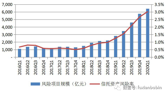 二是信托行業(yè)風(fēng)險(xiǎn)資產(chǎn)規(guī)模及不良率持續(xù)攀升。在金融去杠桿、強(qiáng)監(jiān)管的宏觀政策背景下,銀行表外資金加速回表,同時(shí)平臺(tái)公司舉債受限,企業(yè)現(xiàn)金流相對(duì)緊張,部分信托公司展業(yè)較為激進(jìn),前期高速發(fā)展積聚的風(fēng)險(xiǎn)開(kāi)始加速釋放,導(dǎo)致信托計(jì)劃逾期甚至違約事件增多。早在2020年一季度,信托業(yè)協(xié)會(huì)在2020年6月發(fā)布的《2020年1季度中國(guó)信托業(yè)發(fā)展評(píng)析》中表示,隨著風(fēng)險(xiǎn)資產(chǎn)規(guī)模的增加以及行業(yè)整體信托資產(chǎn)規(guī)模的壓降,信托資產(chǎn)風(fēng)險(xiǎn)率也在持續(xù)提升。2020年1季度末,信托業(yè)資產(chǎn)風(fēng)險(xiǎn)率為3.02%,較2019年末提升0.35%;但環(huán)比增幅較2019年末的0.57%下降了0.22個(gè)百分點(diǎn)。從風(fēng)險(xiǎn)項(xiàng)目數(shù)量和風(fēng)險(xiǎn)資產(chǎn)規(guī)模的環(huán)比變動(dòng)來(lái)看,2020年1季度末,信托業(yè)風(fēng)險(xiǎn)項(xiàng)目個(gè)數(shù)為1626個(gè),環(huán)比增加79個(gè),增幅為5.11%。2020年1季度末,信托行業(yè)風(fēng)險(xiǎn)資產(chǎn)規(guī)模為6431.03億元,環(huán)比增加660.56億元,增幅11.45%。從同比來(lái)看,2020年1季度末信托項(xiàng)目數(shù)量和風(fēng)險(xiǎn)資產(chǎn)規(guī)模同比增幅分別為61.63%和127.20%。2020年1季度,在新冠疫情以及監(jiān)管部門(mén)加大風(fēng)險(xiǎn)排查力度的影響下,信托行業(yè)風(fēng)險(xiǎn)仍在持續(xù)暴露。但預(yù)計(jì)信托風(fēng)險(xiǎn)資產(chǎn)規(guī)模變化2020年將趨平穩(wěn),行業(yè)風(fēng)險(xiǎn)整體可控。