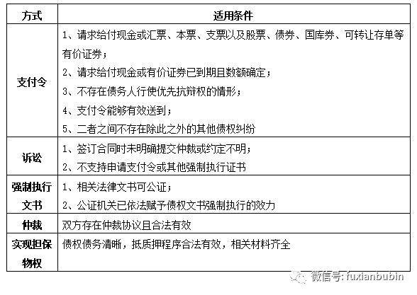 即通過(guò)民事訴訟、民商事仲裁、民事督促(支付令)、執(zhí)行公證債權(quán)文書(shū)、直接向法院申請(qǐng)實(shí)現(xiàn)擔(dān)保物權(quán)的方式,確立債權(quán)的合法性,依靠強(qiáng)制程序收回債權(quán)的清收處置方式。主要適用于債務(wù)人出現(xiàn)生產(chǎn)經(jīng)營(yíng)陷入困境、財(cái)務(wù)狀況嚴(yán)重惡化,債務(wù)履行困難,停止?fàn)I業(yè)或?qū)嶋H控制人下落不明,債務(wù)人還款意愿差,有明顯轉(zhuǎn)移資產(chǎn)或逃廢債務(wù)的行為,主要負(fù)責(zé)人或?qū)嶋H控制人涉及刑事案件等情形。其具體適用情形如下表: