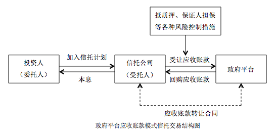 以目前政府平臺(tái)融資主要采用的應(yīng)收賬款轉(zhuǎn)讓加回購(gòu)的融資模式為例,信托公司發(fā)行信托計(jì)劃,募集信托資金,受讓政府融資平臺(tái)持有的應(yīng)收賬款,以該資產(chǎn)未來的現(xiàn)金流作為信托計(jì)劃的未來現(xiàn)金流入來源,平臺(tái)公司以此融入資金,到期后由其回購(gòu)應(yīng)收賬款,實(shí)現(xiàn)信托計(jì)劃退出。