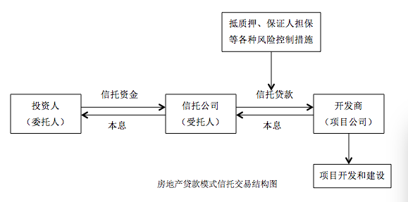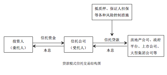 信托公司通過信托計(jì)劃向投資人募集資金并向房地產(chǎn)公司、政府平臺(tái)、上市公司、大型集團(tuán)公司等發(fā)放貸款,融資方以其關(guān)聯(lián)資產(chǎn)進(jìn)行抵質(zhì)押、保證人擔(dān)保等各種風(fēng)險(xiǎn)措施保證債權(quán)安全,到期后由融資方還本付息。