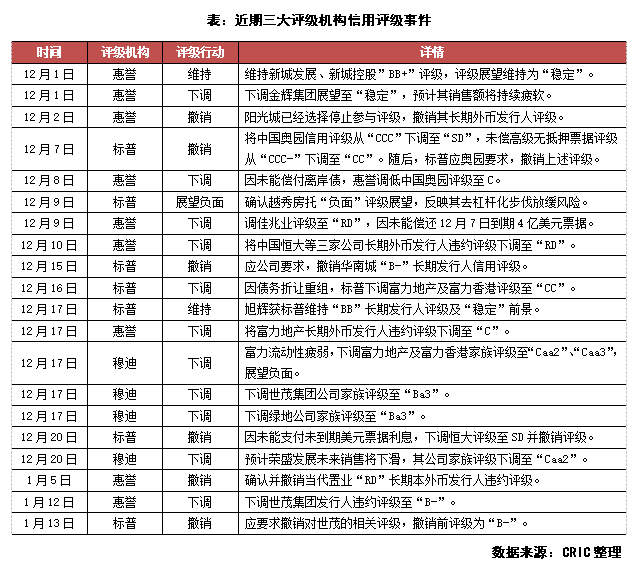 從三大評級機(jī)構(gòu)的態(tài)度來看,未來2022年房企的境內(nèi)外融資環(huán)境依然嚴(yán)峻。據(jù)不完全統(tǒng)計(jì),自2021年12月至2022年1月14日,三大評級機(jī)構(gòu)信用評級依舊以下調(diào)為主,下調(diào)事件共出現(xiàn)11起,撤銷評級事件6起,多針對已暴雷或發(fā)生違約的房企;僅有少部分房企獲得評級的維持,評級上調(diào)未有出現(xiàn)。