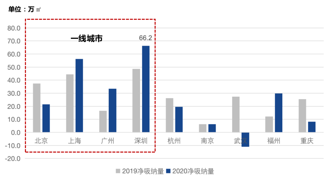 重點二線城市中,武漢受疫情影響最為嚴重,全年凈吸納量為負,杭州與重慶同比下降近3成;南京與去年基本持平,福州受益于三季度整體市場的優異表現同比大幅上升。