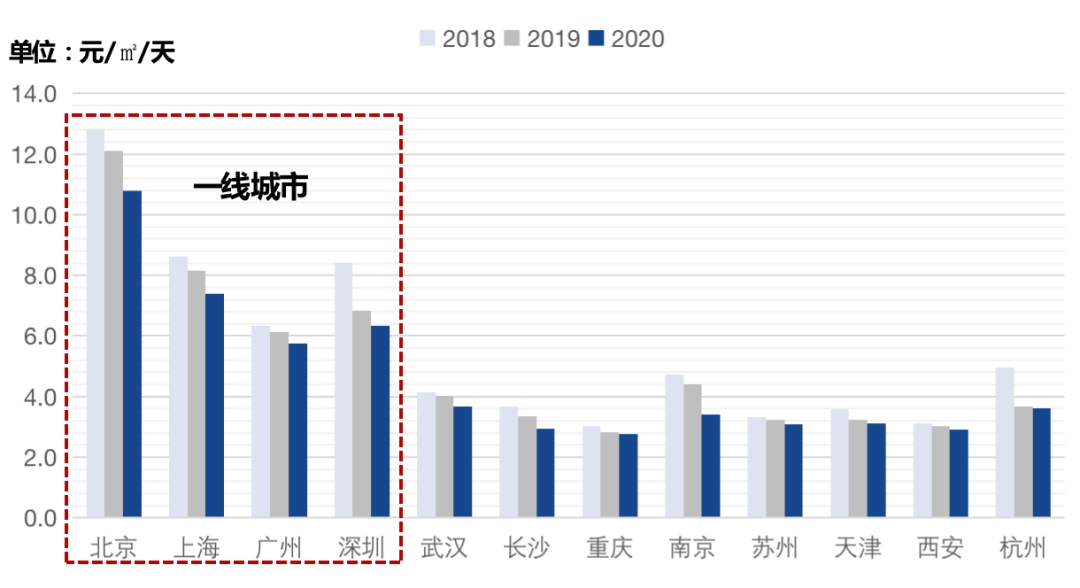 近三年,全國重點辦公城市的甲級寫字樓平均租金均為連續下降趨勢; 截止20年四季度,北京以11.3元/㎡/天領跑全國;在大量新增供應,供大于求的結構下,深圳近幾年與廣州的租金差持續縮小。重點二線城市與一線城市的租金差仍較為明顯,分別為3.2元/㎡/天和7.6元/㎡/天。