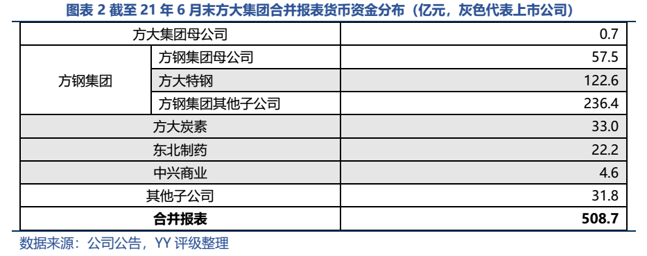 參與海南方大投資的還有方鋼集團及旗下的九江萍鋼、萍鄉萍鋼、達州鋼鐵。不同于方大集團母公司的是,方鋼集團的貨幣資金相對較充裕。截至21年6月末集團貨幣資金達416.5億元,較20年末新增了170.7元(非上市部分增加了110億元),主要依賴票據融資(上半年應付票據從66.1億元增長至224.2億元)。