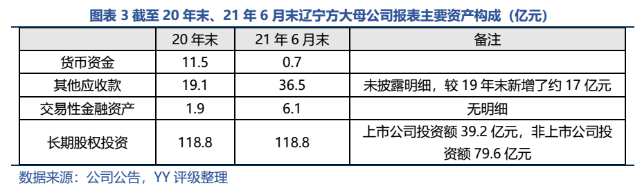 雖然方大集團合并報表貨幣資金較充裕(截至21年6月末達到508.7億元),但都在子公司層面,母公司貨幣資金僅0.66億元。那母公司的收購資金從何處來呢?由于母公司報表長期股權投資21年6月末數據和20年末數據完全相同,因此我們認為雖然海南方大6月份已經成立,但截至6月末股東還未實際投入資金。我們以母公司中報數據切入來看母公司層面有哪些可動用的資源。