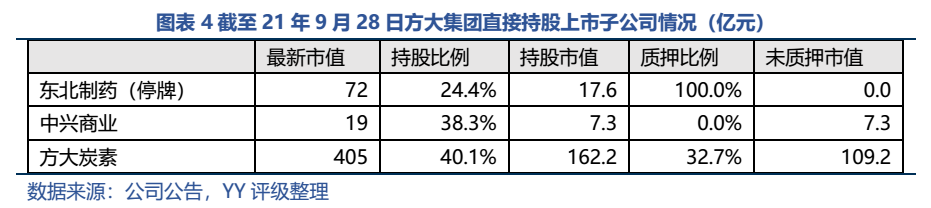 長期股權投資方面,上市公司投資額39.2億元,非上市公司投資額79.6億,我們對于上市公司投資額部分以市值來看其騰挪空間。東北制藥的股票目前處于停牌狀態,且方大集團持股市值全部質押,難以動用到海航身上。主要可動用資源包括方大炭素的股票未質押市值約110億元、中興商業的股票未質押市值約7億元,可進行減持套現或者質押融資。