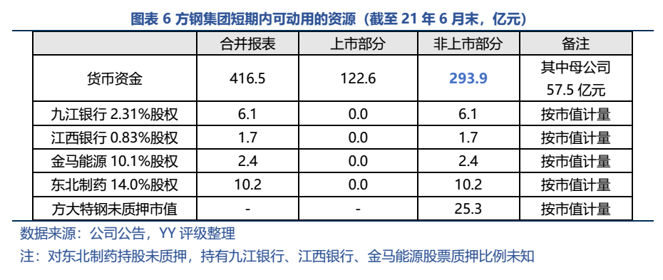 方鋼集團資產主要由萍鋼實業(九江萍鋼、萍鄉萍鋼的母公司)、達州鋼鐵、上市公司方大特鋼、母公司資產構成,因此我們以集團報表扣除上市公司方大特鋼部分來計算集團方鋼系可以為收購海航短期動用的資源。