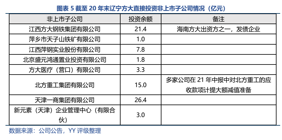 非上市公司部分,截至20年末投資明細如下(估計21年上半年未發生變化)。方鋼集團(上市公司方大特鋼的母公司)為發債企業,截至21年6月末其賬面歸母凈資產218億元,方大集團對其100%持股,母公司報表采用歷史成本法僅計入投資額21.4億元,若處置部分股權能釋放不少資金。其他公司透明度較低,且作為非上市公司,預計短期內處置變現的難度也較大。