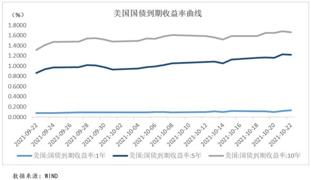 本周,美國公布數(shù)據(jù)顯示美國高通脹仍將持續(xù)運行,各期限美債收益率紛紛上漲。具體來看,本周1年期、5年期和10年期美國國債平均收益率較上周上漲0.65個BP、10.05個BP和8.10個BP至0.11%、1.19%和1.65%。