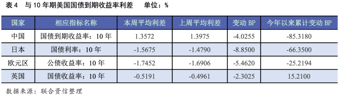 本周各期限中美國債平均收益率利差走勢不一,1年期中美國債平均收益率利差分別較上周走擴2.20個BP至2.25%;5年期和10年期中美國債平均收益率利差分別較上周收窄4.26個和4.03個BP至1.68%和1.36%。本周1年期、5年期和10年期日美國債平均收益率利差分別較上周走擴0.63個、10.20個和8.85個BP至-0.23%、-1.27%和-1.57%。本周1年期歐元區(qū)公債與相應(yīng)期限美債平均收益率利差分別較上周收窄1.80個BP至-0.82%;5年期和10年期歐元區(qū)公債與相應(yīng)期限美債平均收益率利差分別較上周走擴3.77個和5.46個BP至-1.63%和-1.75%。本周5年期英美國債平均收益率利差分別較上周收窄2.54個BP至-0.33%;10年英美國債平均收益率利差分別較上周走擴2.30個BP至-0.52%。
