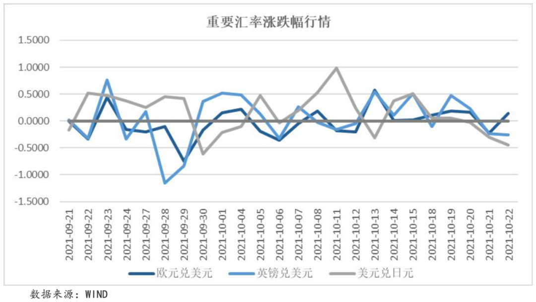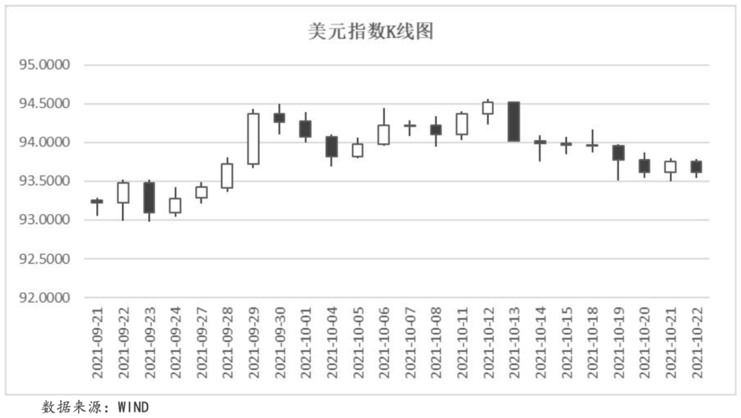本周,美元指數(shù)出現(xiàn)下跌。一方面,美國“褐皮書”顯示經(jīng)濟增速已呈現(xiàn)放緩的狀態(tài),打壓美元走勢;另一方面,隨著美國PMI制造業(yè)數(shù)據(jù)的釋出顯示美國勞動力和供應(yīng)鏈的問題仍將繼續(xù)限制制造業(yè)的恢復,市場對美國經(jīng)濟的復蘇預期受到打壓。截至本周五,美元指數(shù)收于93.6116,周內(nèi)累計收跌0.38%。
