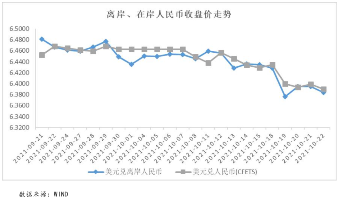 本周,中國三季度GDP增幅同比達4.9%,經(jīng)濟復蘇持續(xù)穩(wěn)定向好;而美國通脹問題持續(xù),經(jīng)濟恢復不確定性增加。因此,在岸和離岸人民幣匯率均呈現(xiàn)波動走強態(tài)勢。截至周五,美元兌離岸人民幣匯率收于6.3839,周內(nèi)小幅下跌0.79%;美元兌在岸人民幣匯率收于6.3903,周內(nèi)累計收跌0.66%。