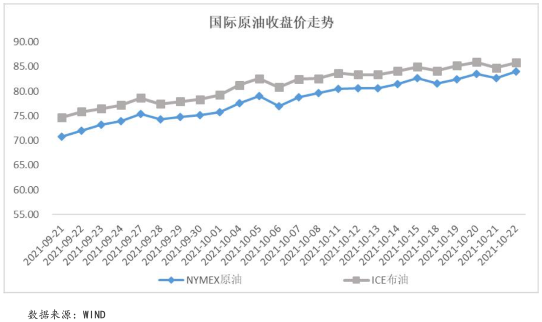 本周,國際油價繼續(xù)周內(nèi)全面上漲。一是隨著全球經(jīng)濟復蘇步伐的加快,石油需求顯著上升,如10月美國和歐元區(qū)PMI制造業(yè)和服務(wù)業(yè)活動指數(shù)仍然高于50,經(jīng)濟活動仍在擴張;二是隨著亞洲市場對石油需求的上升(韓國11月原油購買量創(chuàng)下歷史最高水平),當下的石油供給結(jié)構(gòu)將進一步緊張。三是各國能源儲備逐漸下降的基礎(chǔ)上,OPEC+仍保持原計劃產(chǎn)出,供應(yīng)趨緊。總體來看,在供應(yīng)不足的條件下,強勁的需求拉動石油價格上揚。截至本周五收盤,NYMEX原油價格收于83.98美元/桶,周內(nèi)累計收漲2.41%;ICE布油價格收于85.77美元/桶,周內(nèi)累計收漲0.97%。