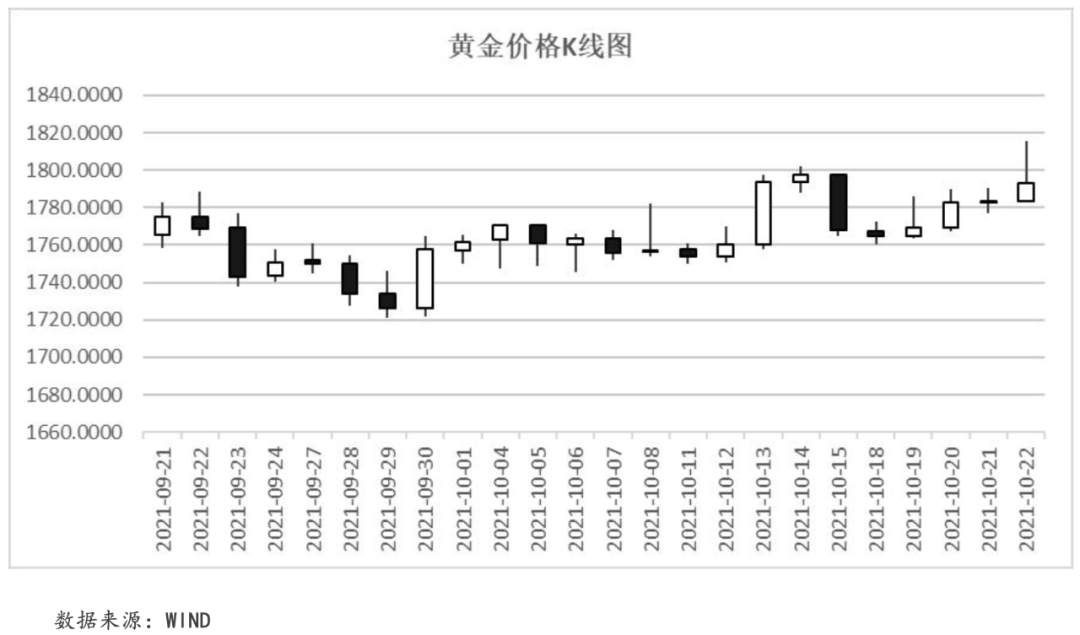 本周,美國“褐皮書”的公布顯示出,美國經(jīng)濟增速有所放緩的同時,通脹問題日益嚴峻。供應(yīng)鏈的中斷、原材料價格上漲、能源價格上漲和勞動力的恢復緩慢都讓人們意識到這些共同助推高通脹的因素在短期內(nèi)并不能有所改善。高通脹的持續(xù)拉升了市場避險情緒,黃金作為抗通脹的主要避險工具,因此金價走高。截至本周五,COMEX黃金價格收于1,793.10美元/盎司,周內(nèi)累計收漲1.45%,連續(xù)第二周上漲。