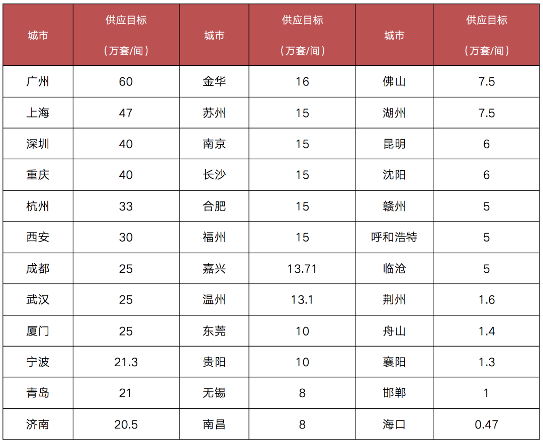 表:部分城市“十四五”時(shí)期新增保障性租賃住房供應(yīng)目標(biāo)(萬(wàn)套/間)