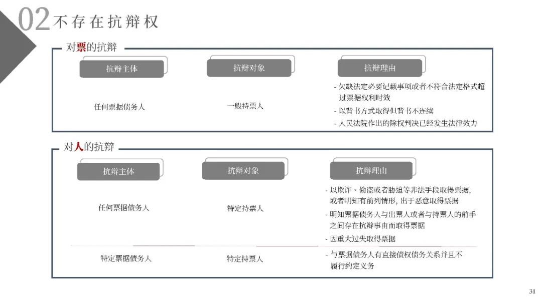 第十三條票據債務人不得以自己與出票人或者與持票人的前手之間的抗辯事由,對抗持票人。但是,持票人明知存在抗辯事由而取得票據的除外。票據債務人可以對不履行約定義務的與自己有直接債權債務關系的持票人,進行抗辯。本法所稱抗辯,是指票據債務人根據本法規定對票據債權人拒絕履行義務的行為。