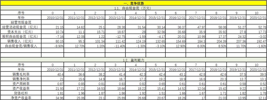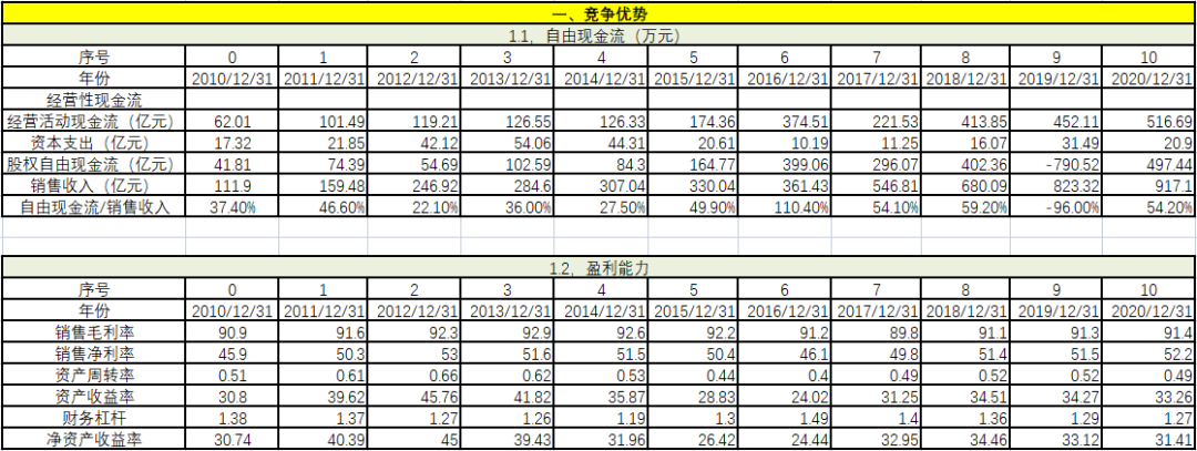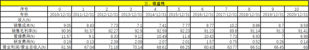 從競爭優(yōu)勢上看,自由現(xiàn)金流/銷售收入在過去11年中有1年為負(fù),剩余10年都遠(yuǎn)遠(yuǎn)大于5%,經(jīng)營績效異常穩(wěn)健。毛利率基本不變,維持在90%以上,說明對上下游都有極強(qiáng)的把控力。在毛利率不變的情況下,凈利率穩(wěn)步提升。資產(chǎn)周轉(zhuǎn)率基本保持不變,說明企業(yè)雖然在變大,但經(jīng)營效率持續(xù)穩(wěn)定。資產(chǎn)收益率和凈資產(chǎn)收益率穩(wěn)步提升,財(cái)務(wù)杠桿略有下降。從這些指標(biāo)可以看出,該企業(yè)的競爭優(yōu)勢非常明顯。