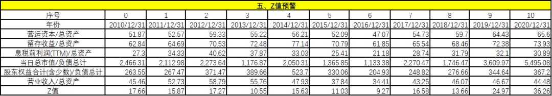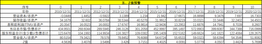從上面的Z值可以看出,該企業(yè)的Z值非常高,遠(yuǎn)遠(yuǎn)超過了2.675,財(cái)務(wù)狀況良好,發(fā)生破產(chǎn)的概率非常小。
